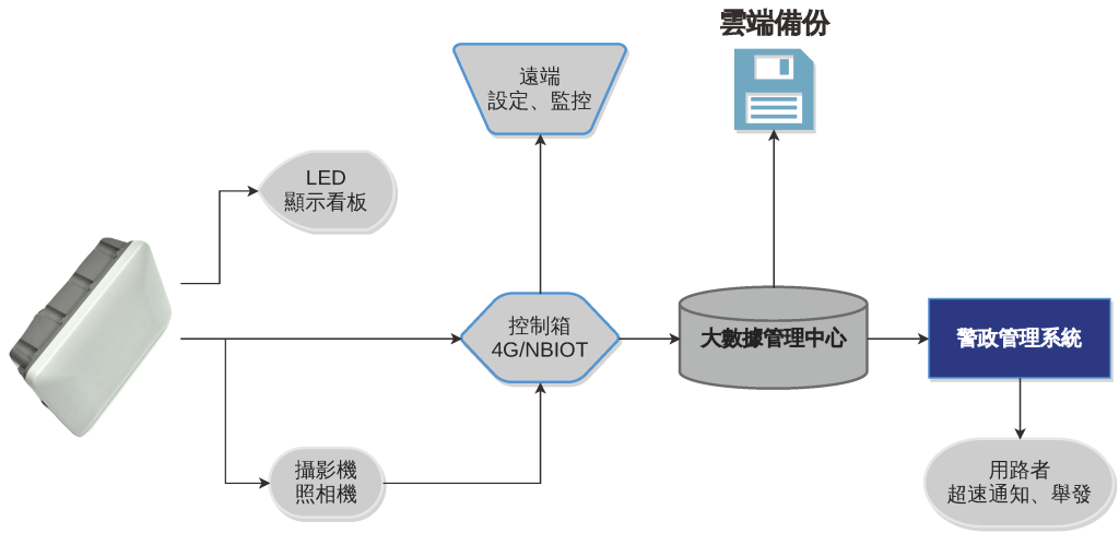 同時可搭配聲、光、電設備,提出即時速限警示,達到超速嚇阻的功能。